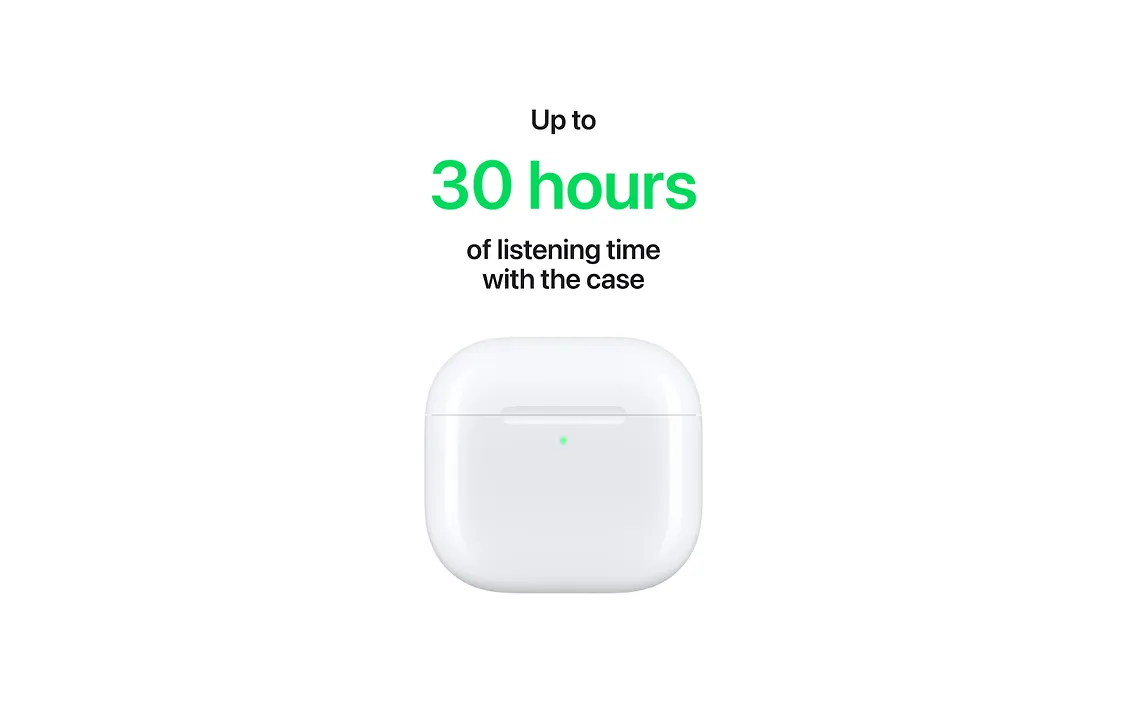 Saat jopa 5 tuntia kuunteluaikaa yhdellä latauksella.(6) Ja saat yhteensä jopa 30 tuntia kuunteluaikaa koteloa käyttäessäsi.(7)